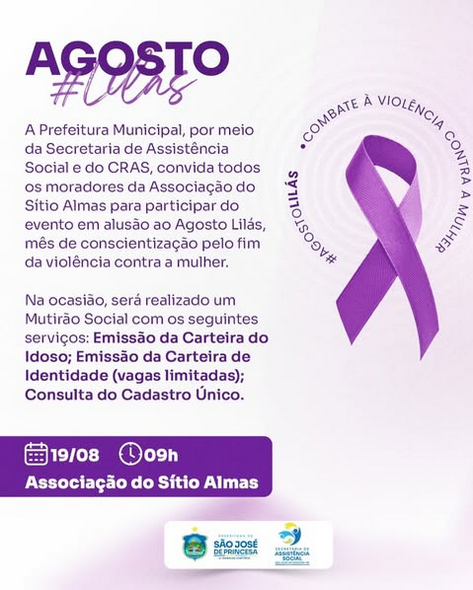 Compartilhar: Secretaria de Assistência Social realizará evento do Agosto Lilás na Associação do Sítio Almas segunda-feira, 18 de agosto de 2025 Convite. Especiais